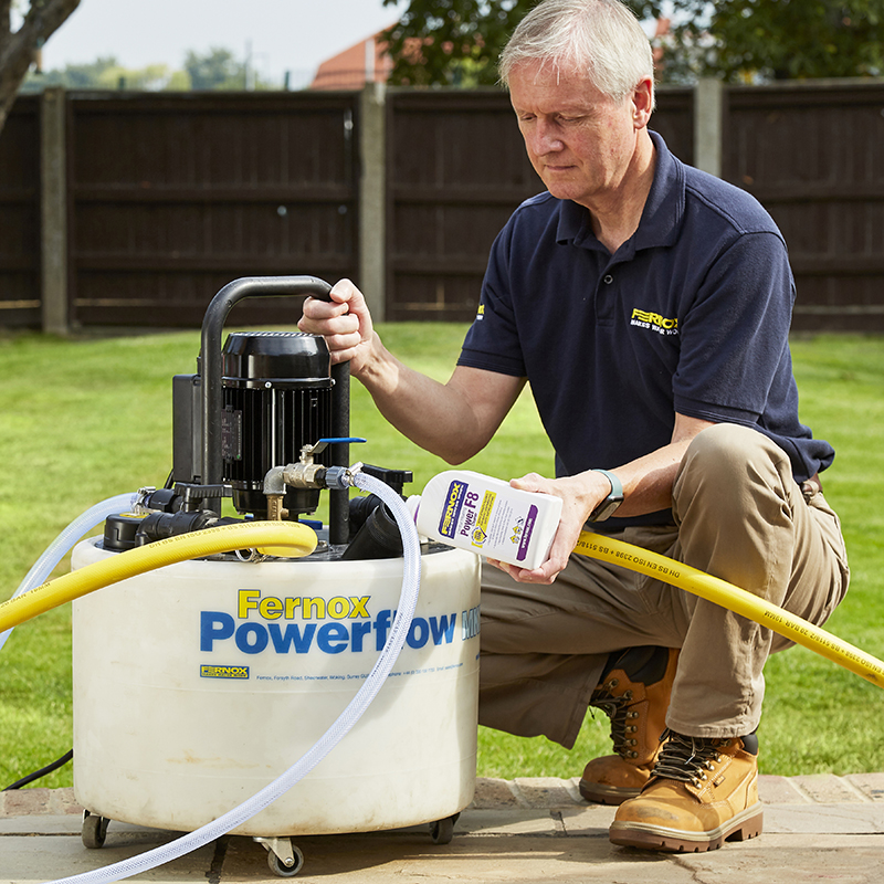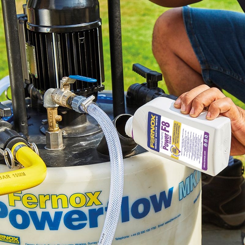 În unele cazuri, poate fi necesară o dozare repetată sau suplimentară de Power Cleaner F8. Drenați și curățați bine, cel puțin de două ori, până când apa care curge este limpede. La utilizarea Power Cleaner F8 cu o mașină de curățare prin purjare, spălați dinamic au apă de la rețea până când apa este curată. Reumpleți sistemul adăugând Fernox Protector F1 (sau Fernox Protector+ Filter Fluid pentru sisteme cu filtru de sistem încorporat) pentru o protecție de lungă durată împotriva coroziunii și a depunerilor de calcar. În cazul cilindrilor indirecți cu alimentare unică, cum ar fi „Primatic” sau alți cilindri similari, trebuie utilizate substanțe chimice pentru apă potabilă.