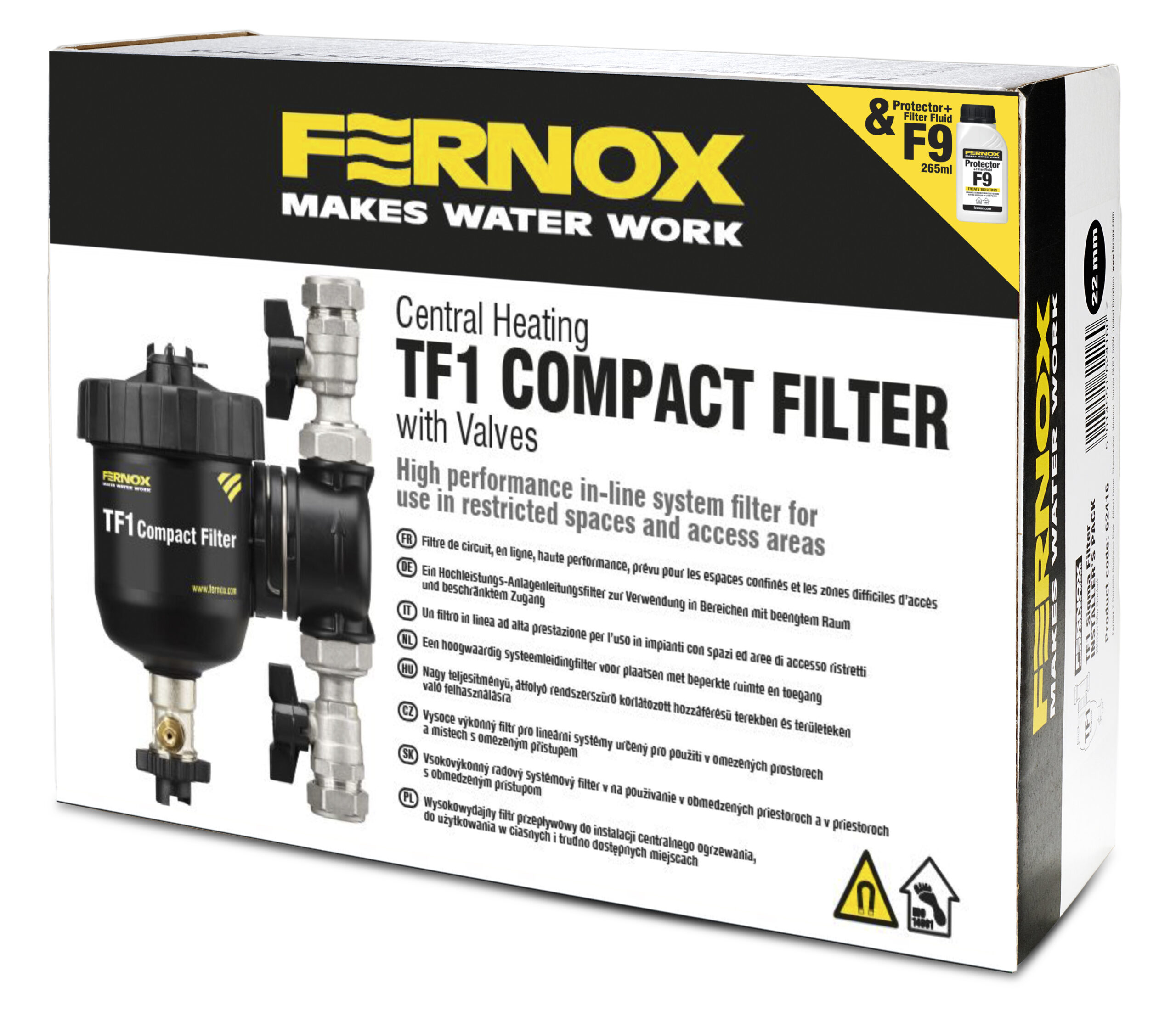 Filtrul TF1 Compact poate fi conectat direct la sistemul de conducte folosind racordurile de robinet furnizate. Filtrul poate fi instalat în oricare dintre cele 24 de poziții separate permise de mecanismul său de admisie/evacuare unic. Filtrul Fernox TF1 Compact (Brevet eliberat în Marea Britanie cu nr. 2448232) este un filtru integrat de înaltă performanță, care combină acțiunea hidrociclonică cu ansamblurile de magneți special concepute, pentru a elimina atât agenții de contaminare magnetici, cât și pe cei nemagnetici din apa din sistem, reținându-i în interiorul filtrului. Filtrul poate fi instalat pe conducte verticale sau orizontale, în funcție de direcția fluxului indicată de săgeata de pe colector. Filtrul este conceput pentru a proteja cazanul de efectele dăunătoare ale resturilor de coroziune circulante, care s-au adunat în sistem ca urmare a unei reacții chimice rezultate în urma contactului dintre apă și metale amestecate utilizate în cadrul unui sistem de încălzire și răcire. În mod ideal, filtrul trebuie montat pe conducta de retur la cazan și poate fi instalat la un unghi de până la 45⁰ din poziția verticală dacă spațiul sau înălțimea la nivelul capului sunt limitate.