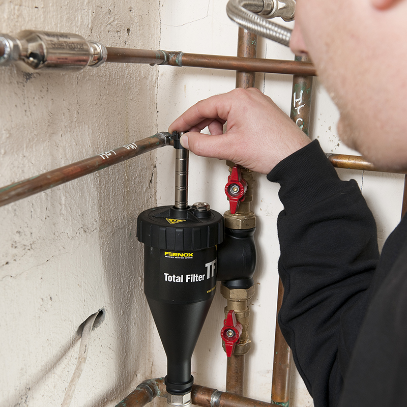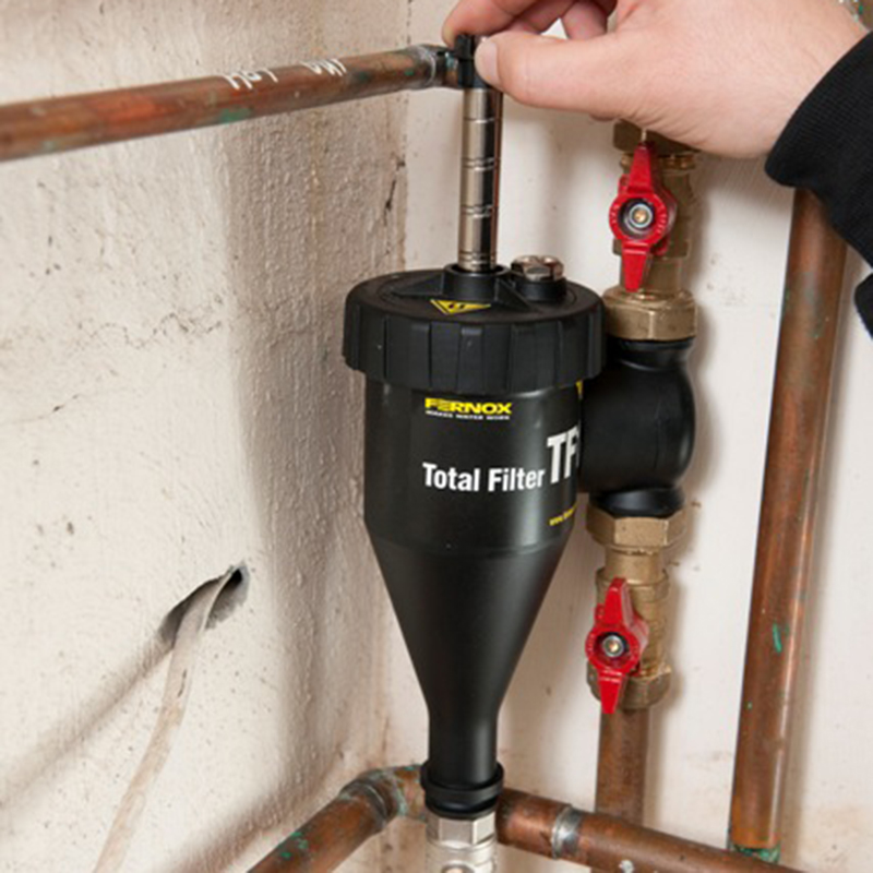 Filtrul TF1 Total poate fi conectat direct la sistemul de conducte prin e folosind racordurile de robinet furnizate. Filtrul TF1 Total poate fi instalat în oricare dintre cele 24 de poziții separate permise de mecanismul său de admisie/evacuare unic. Filtrul TF1 Total (Brevet eliberat în Marea Britanie cu nr. 2448232) este un filtru integrat de înaltă performanță, care combină acțiunea hidrociclonică cu ansamblurile de magneți special concepute, pentru a elimina atât agenții de contaminare magnetici, cât și pe cei nemagnetici din apa din sistem, reținându-i în interiorul filtrului.